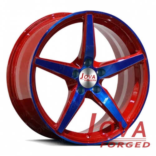 This aluminum car rims are monoblock forged wheels, two colored finish with gloss red and blue paint, , a monoblock aluminum alloy center cap, 5 hole, star spoke. We offer custom forged car rims from 17" to 24" to fit your requirement. welcome to visit our factory in Guangzhou, China.